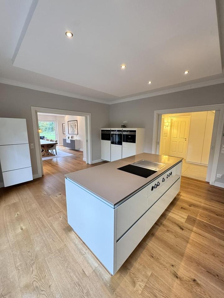 •Küche: Offenes Konzept, beidseitig per Schiebetüren abtrennbar; drei Terrassenelemente. Hochwertige Einbaugeräte, Kochfeld, Teppanyaki, BORA-Dunstabzug. Double-Door-Kühlschrank mit Eiswürfel-/Crushed-Ice-Funktion.