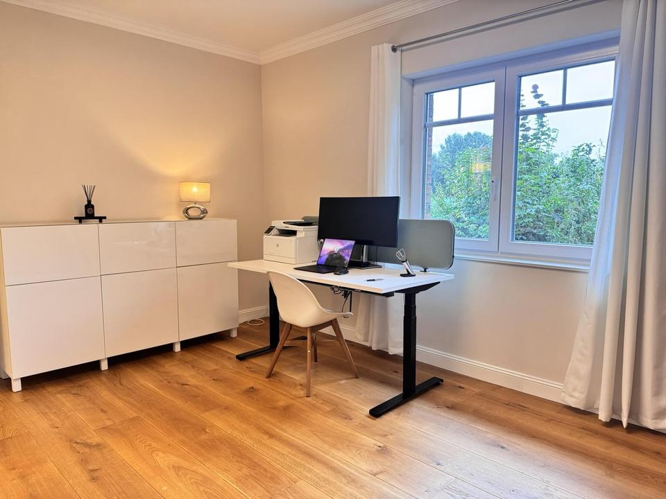 •Böden & Raumgefühl: Wohn-/Essbereich und Arbeitszimmer mit breiten Eichenechtholz-Dielen; übrige EG-Flächen in 60×60 cm Fliesen (Betonoptik). Deckenhöhe 2,8m.