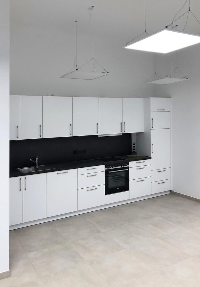 Ausgestattet ist die Einheit mit Fußbodenheizung, eleganten, strapazierfähigen Fliesenböden sowie modernen WCs mit Markenausstattung. Die Teeküche ist mit hochwertigen Siemens-Elektrogeräten versehen und fügt sich harmonisch in das moderne Gesamtbild ein.