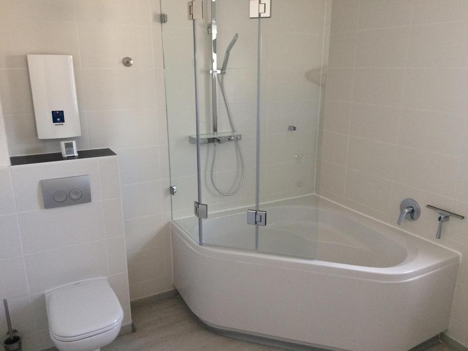 Das Bad ist weiß gefliest, mit Eckbadewanne und Duschabtrennung sowie Anschlüssen für Waschmaschine und Trockner. Waschtisch, Spiegel, Armaturen etc. sind bereits montiert.