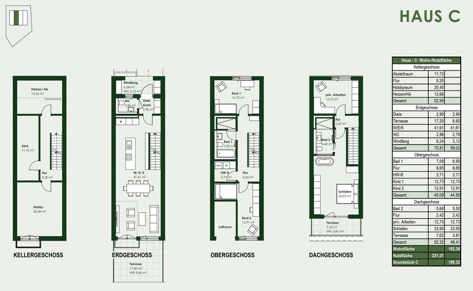 • Untergeschoss/Keller: Hobby- und Abstellflächen sowie Haustechnik; nutzbar für Stauraum, Fitness oder Werkbank.