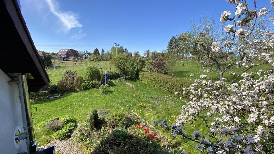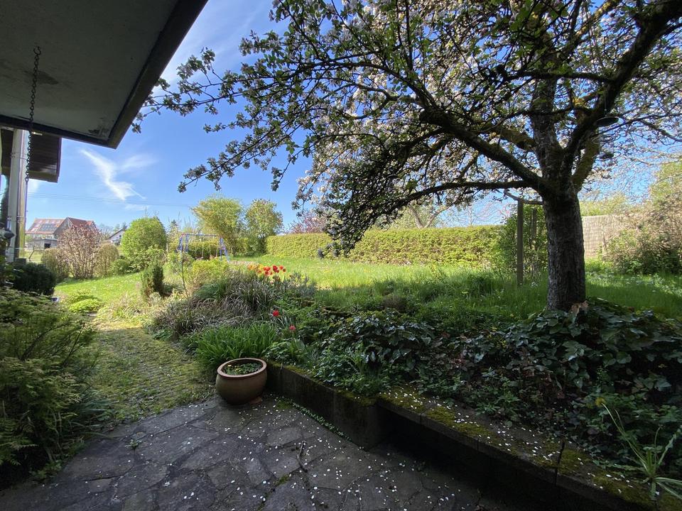 Gewachsener Garten mit Apfelbäumen, Schaukel und massivem Geräteschopf – perfekt für Kinder, Hobbygärtner oder Tierfreunde.