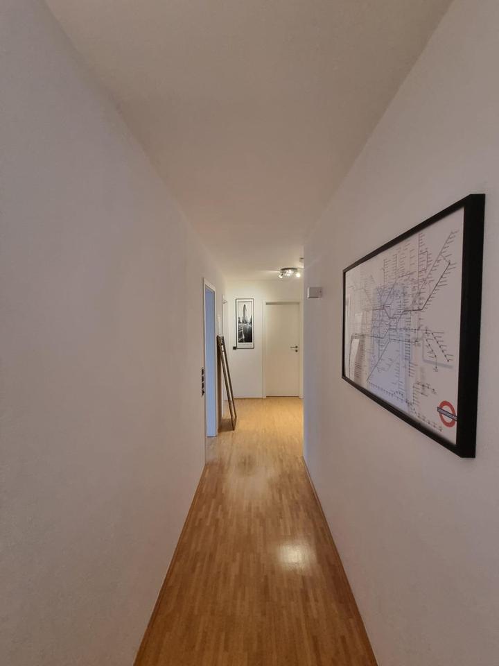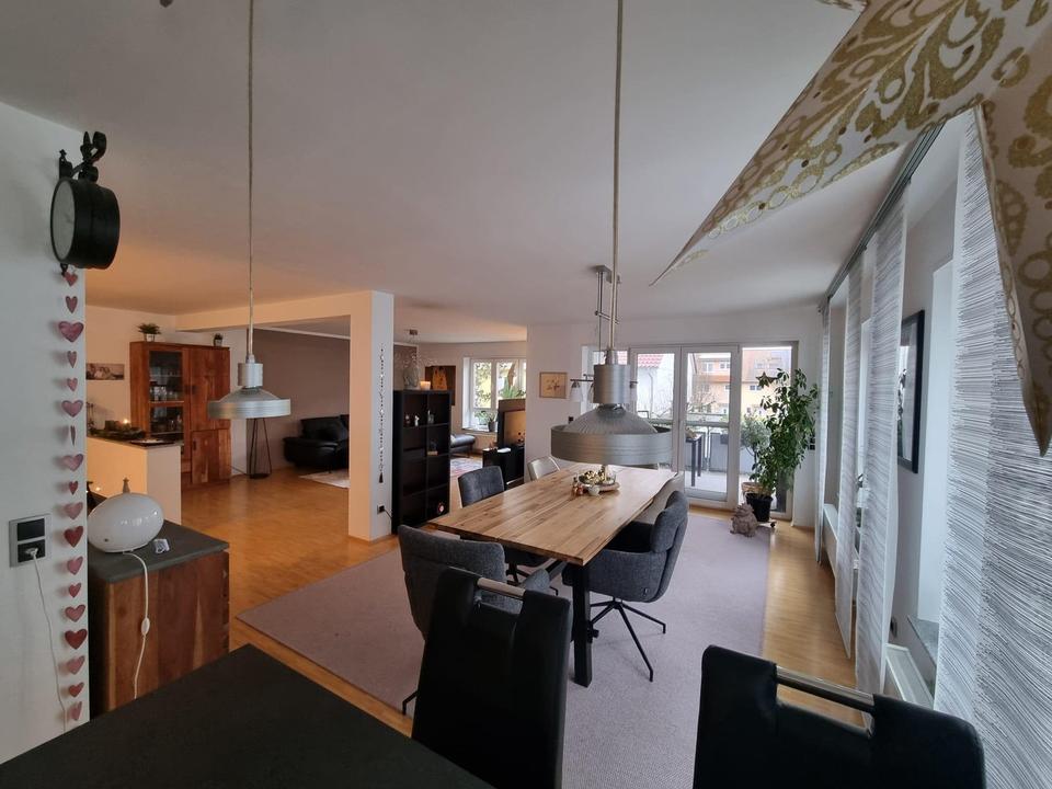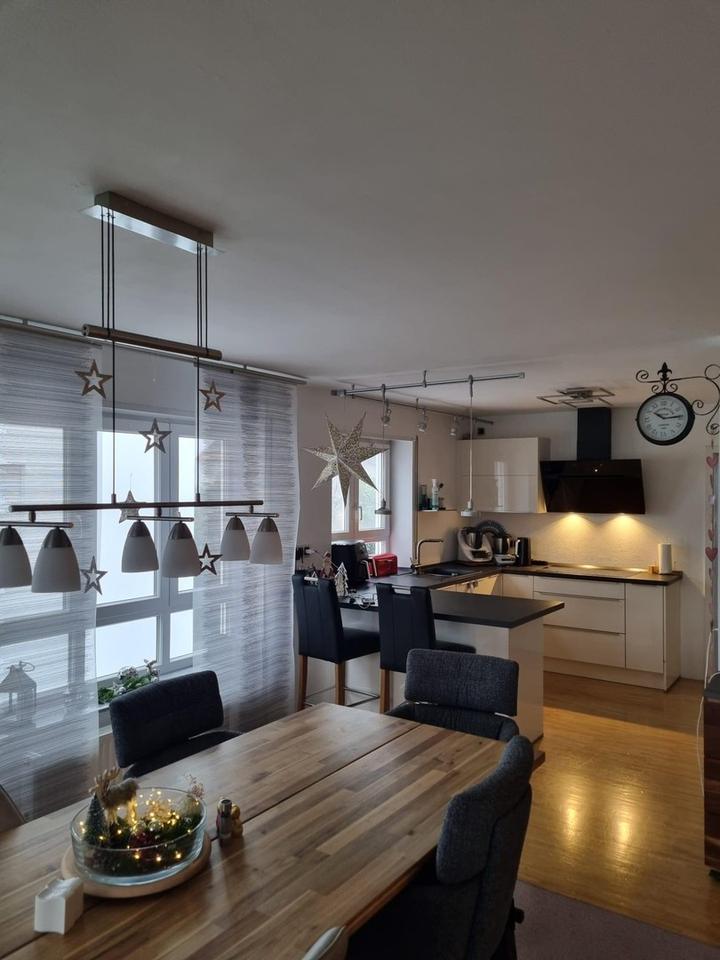 Der offene Wohn- und Essbereich bildet das Herzstück der Wohnung und lädt zu entspannten Familienabenden ebenso ein wie zu geselligen Stunden mit Freunden. Große Fensterflächen sorgen für eine helle, freundliche Wohnatmosphäre.