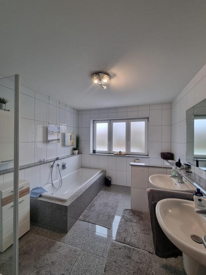Das Tageslichtbad mit Badewanne und Dusche sowie das separate Gäste-WC mit Fußbodenheizung sorgen für Komfort und Entspannung.