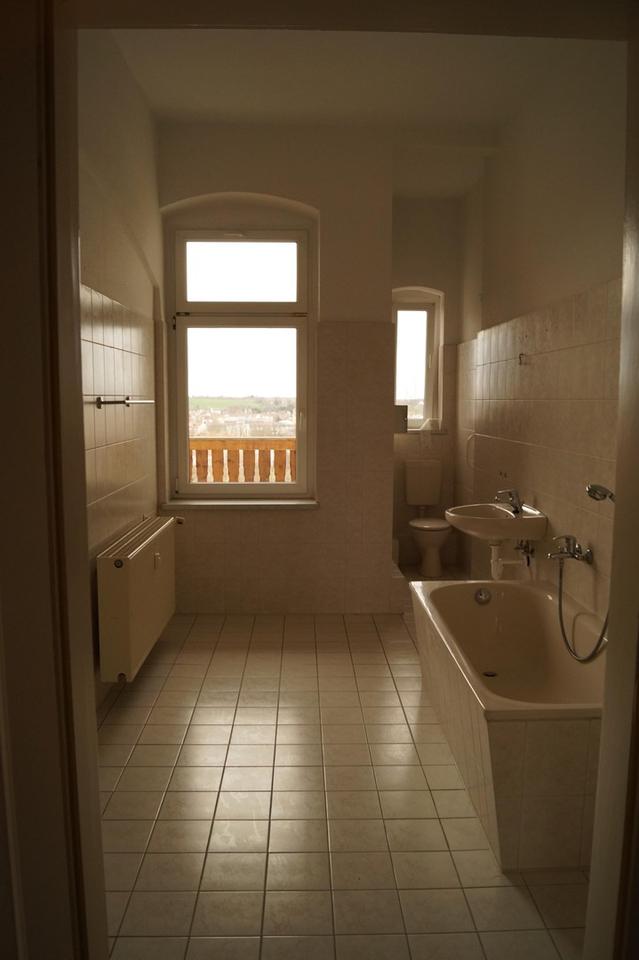 Das Bad mit Badewanne und Fenster ist gefliest. Die große Wohnküche bietet Platz für eine Essecke und hat einen Ausgang zum Balkon zur Hofseite mit Talblick.