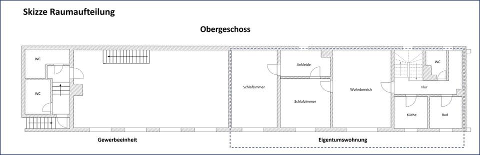 Die Eigentumswohnung (OG) befindet sich über der Gewerbeeinheit im ersten Obergeschoss desselben Gebäudes. Die Wohnfläche von ca. 95 qm verteilt sich auf einen Flur mit Zugang in das Badezimmer, in ein separates WC, in die Küche und in einen großzügigen Wohnbereich. Von dort gelangt man in die beiden Schlafzimmer und in eine Ankleide.