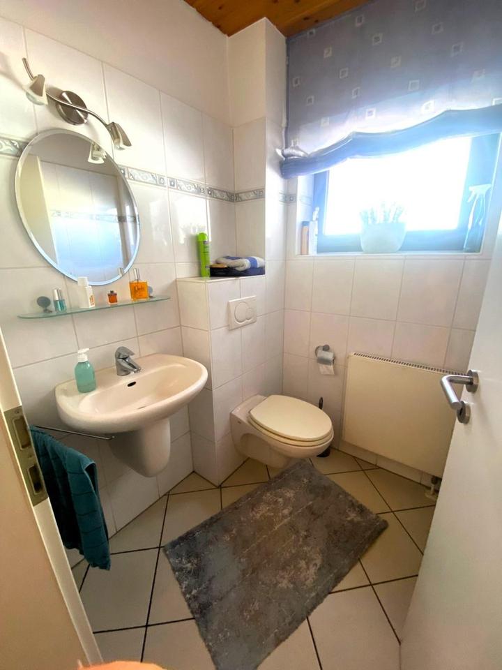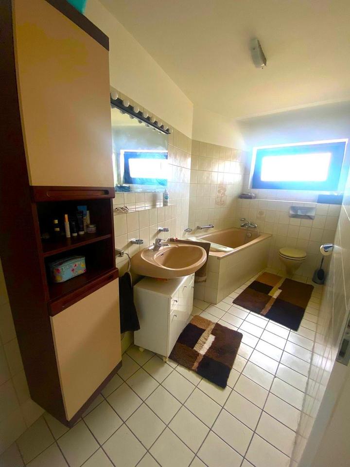 Über das Treppenhaus gelangt man in den 1. Stock. Dort befinden sich das Elternschlafzimmer und zwei weitere Zimmer sowie ein Dusch- und ein Wannenbad. Das Wannenbad ist exklusiv über das Elternschlafzimmer zugänglich. Der Balkon in einem der beiden weiteren Zimmer bietet eine unverbaute Sicht bis nach Rheinbach.