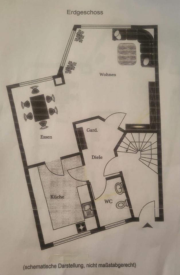 Im Erdgeschoss bildet das helle über 50 qm große Wohn-/Esszimmer mit dem gemauerten Kamin und dem Zugang zum Garten das Zentrum des Hauses. Die große, separate Küche bietet auch noch Platz für eine gemütliche Sitzecke. Außerdem befinden sich hier ein großzügiges Gäste-WC sowie eine vom Treppenhaus getrennte Diele.