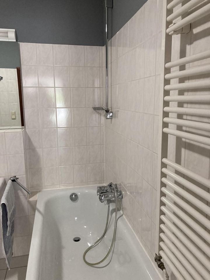 Das Bad ist großzügig geschnitten und verfügt über eine Wanne, eine Duschtrennwand und eine Handtuchheizung. Außerdem ist Platz für eine Waschmaschine.