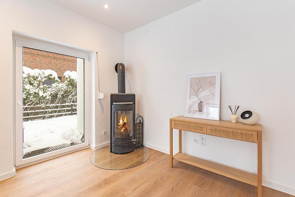 Das Haus besticht durch seine großzügigen, hellen Räume. Nach dem Betreten eröffnet sich der großzügige Wohn- und Essbereich mit offener Küche als Mittelpunkt des Hauses. Große, bodentiefe Fensterflächen schaffen eine helle, freundliche Atmosphäre und öffnen den Blick in den umlaufenden Garten und die große Südwest-Terrasse. Ein Kaminofen sorgt für wohligen Wohnkomfort an kälteren Tagen.