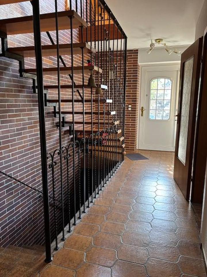Im Erdgeschoss betreten Sie das Haus und kommen in einen geräumigen Flur, von dem die Treppe ins Dachgeschoss und den Keller abgehen.