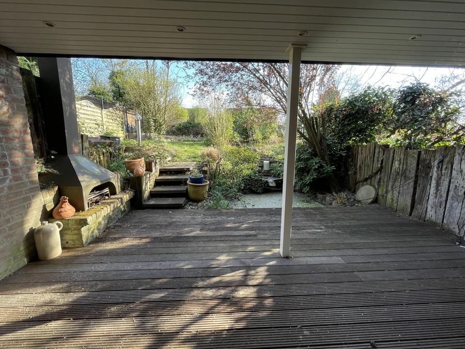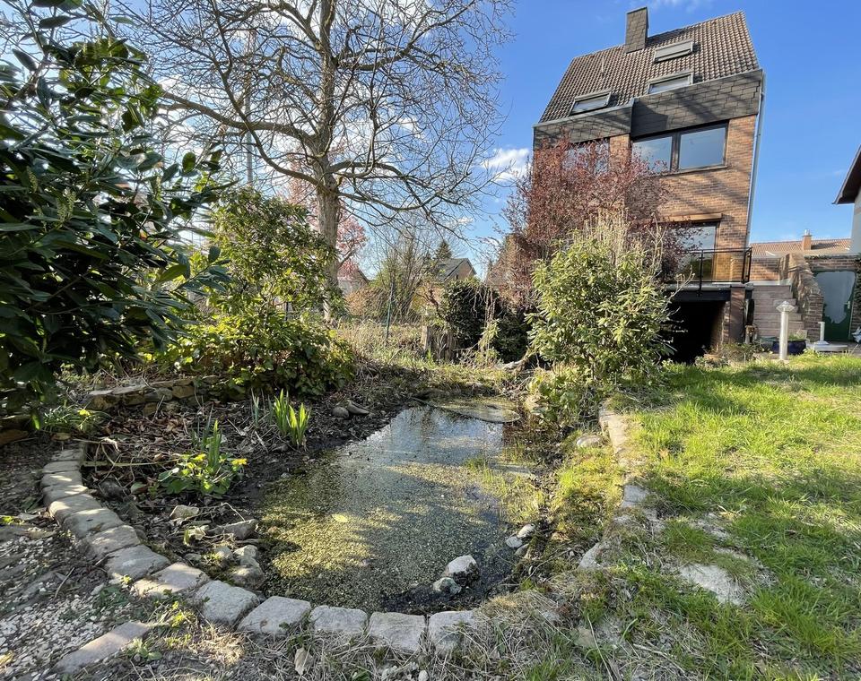 Terrasse mit offenem Kamin, Garten mit Teichanlage.