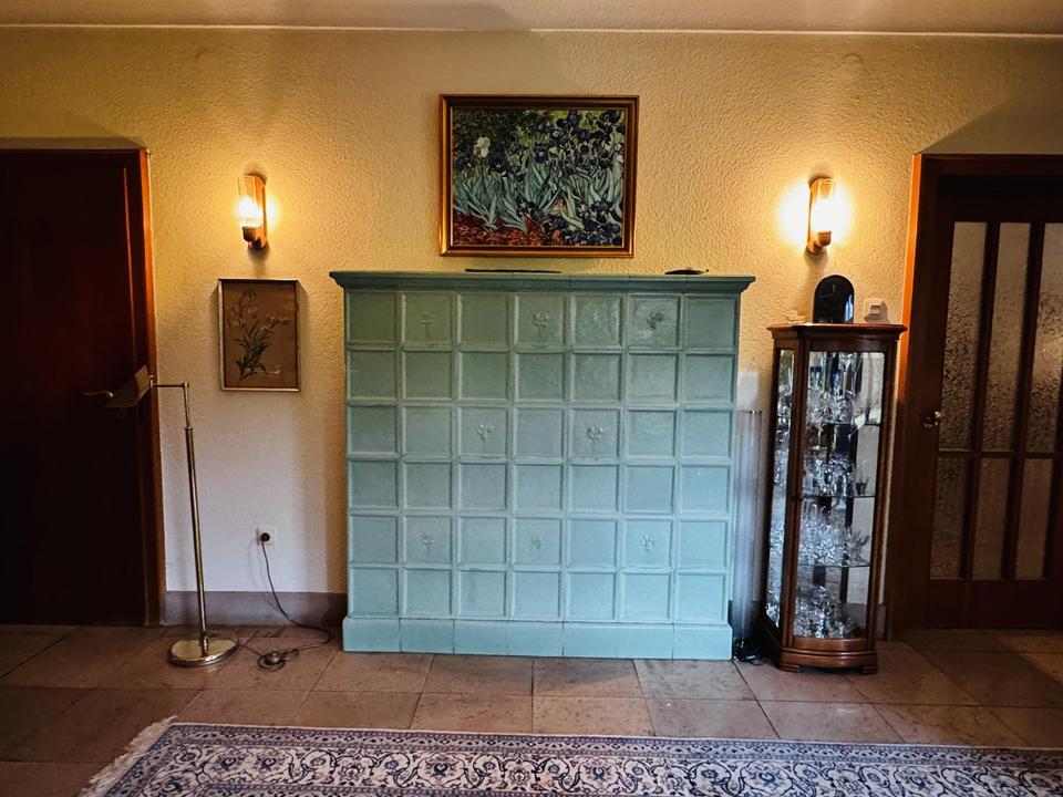 Der große historische Kachelofen, der von einem Ofenraum mit eigenem Zugang beheizt werden kann, wärmt das Esszimmer, das große Wohnzimmer mit Ofenbank und das Lese-/-Fernsehzimmer.