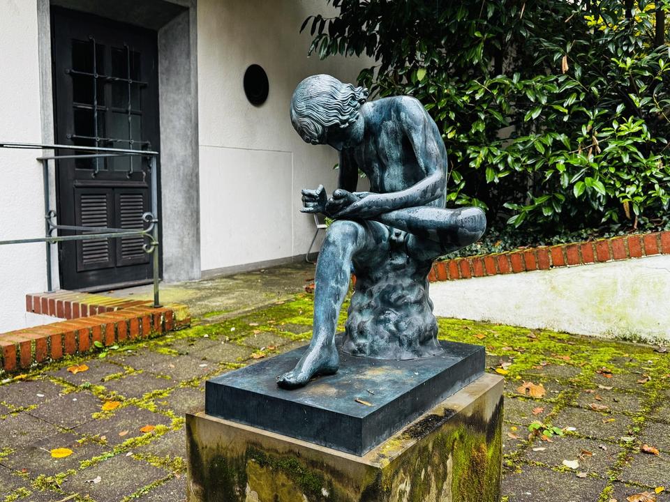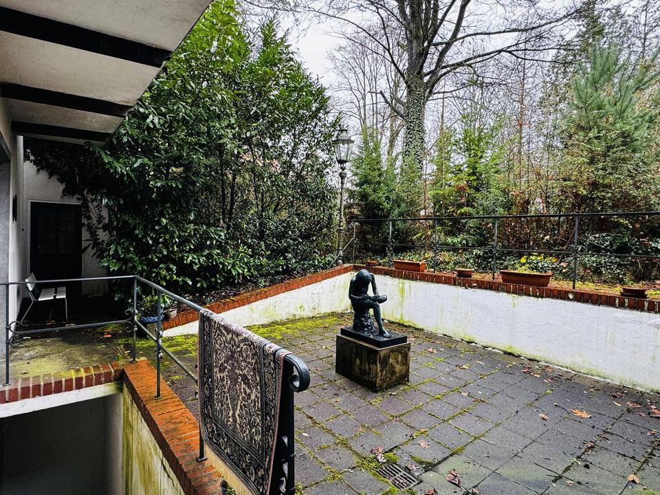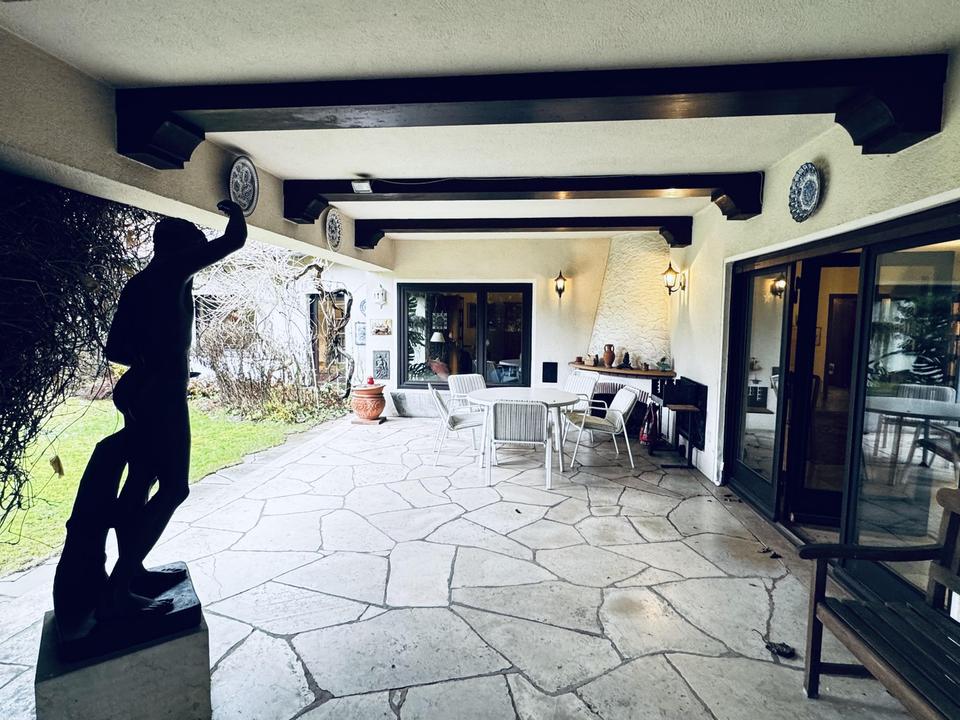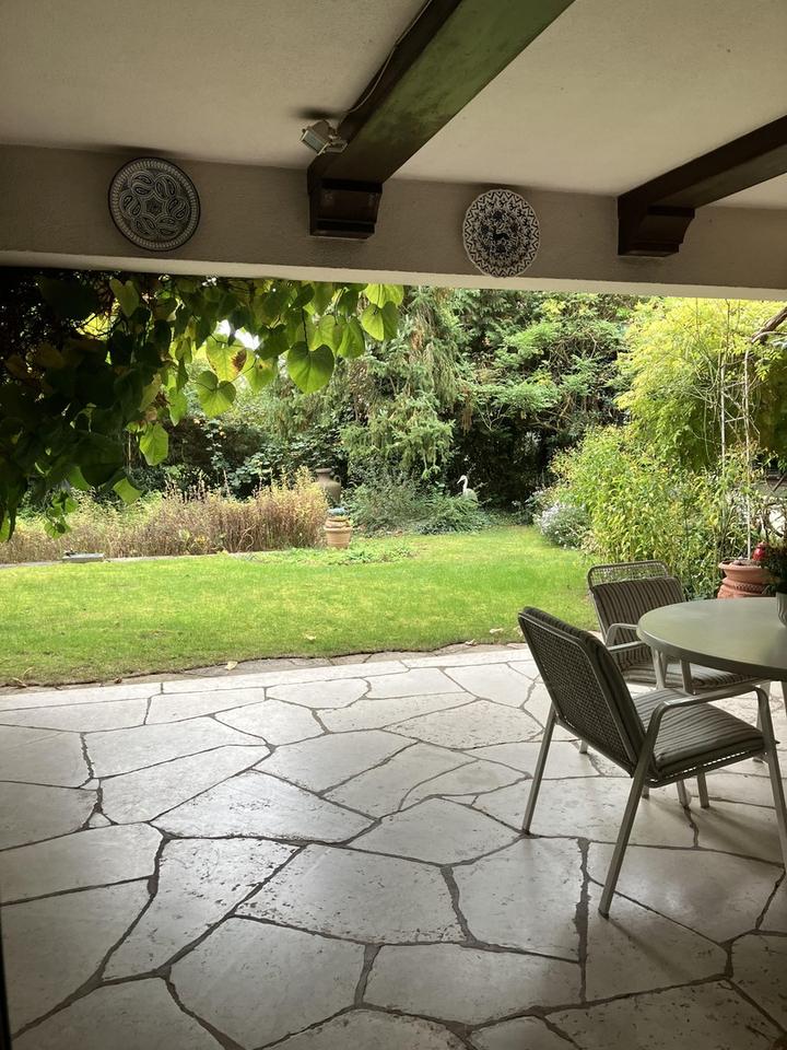 Der großzügige Garten mit der übergroßen überdachten Terrasse mit Außen-Kamin wurde liebevoll bepflanzt und angelegt und durch einen Teich ergänzt. Staudenbeete und ein schöner Baumbestand zusammen mit einer Rasenfläche, wunderbar geeignet für Feste aller Art, und einer Bepflanzung rundherum als Sichtschutz schaffen eine private grüne nicht einsehbare Oase hinter dem Haus, eingebettet in durchgrünte Nachbargrundstücke und eine ruhige Lage in einer Sackgasse mit Waldfläche zum Meerwiesertalweg.