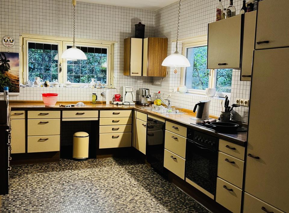 Die große Küche mit Fenstern zu zwei Seiten wird über einen eigenen Flur zum weiterem Zugang zum Garten und einem überdachten Weg zur Garage angebunden, neben ihr liegt ein großer auch zu Wohnzwecken nutzbarer Wirtschaftsraum, der derzeit als Waschküche und großes Lager bzw. Speisekammer dient.