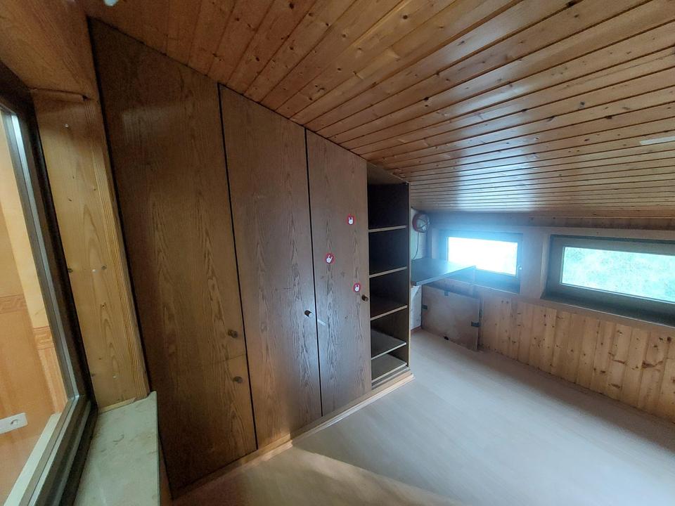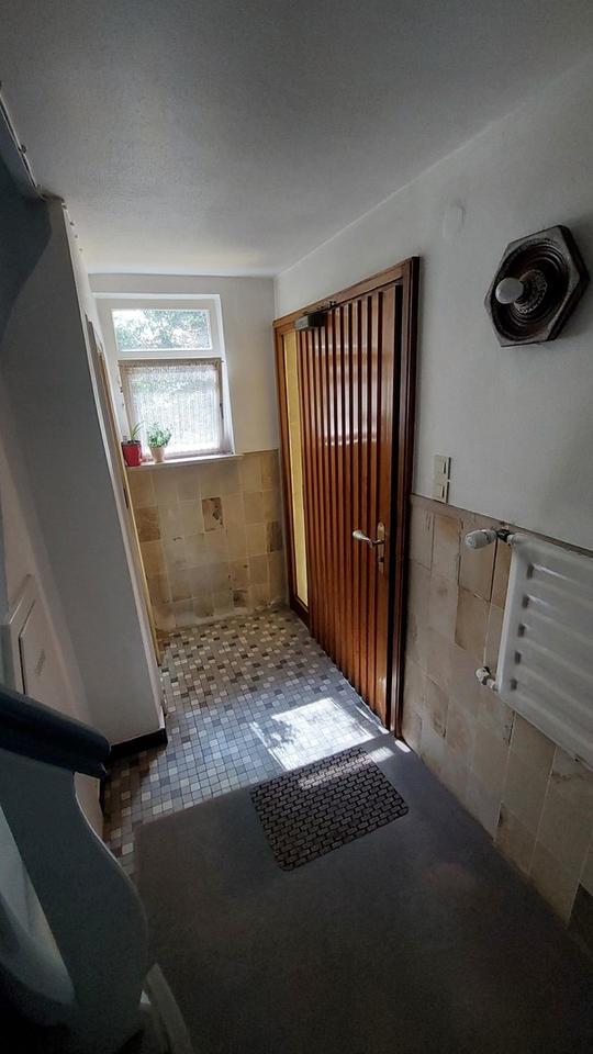 Hier wurde 2016 ein komplett neuer, gedämmter Dachstuhl errichtet, eine Heizungsleitung vom Haupthaus verlegt, sowie die Bodenaufbauten erneuert, gedämmt und abgedichtet, sowie eine diffusionsoffene Dämmung der Rückwand zum Hang ausgeführt.