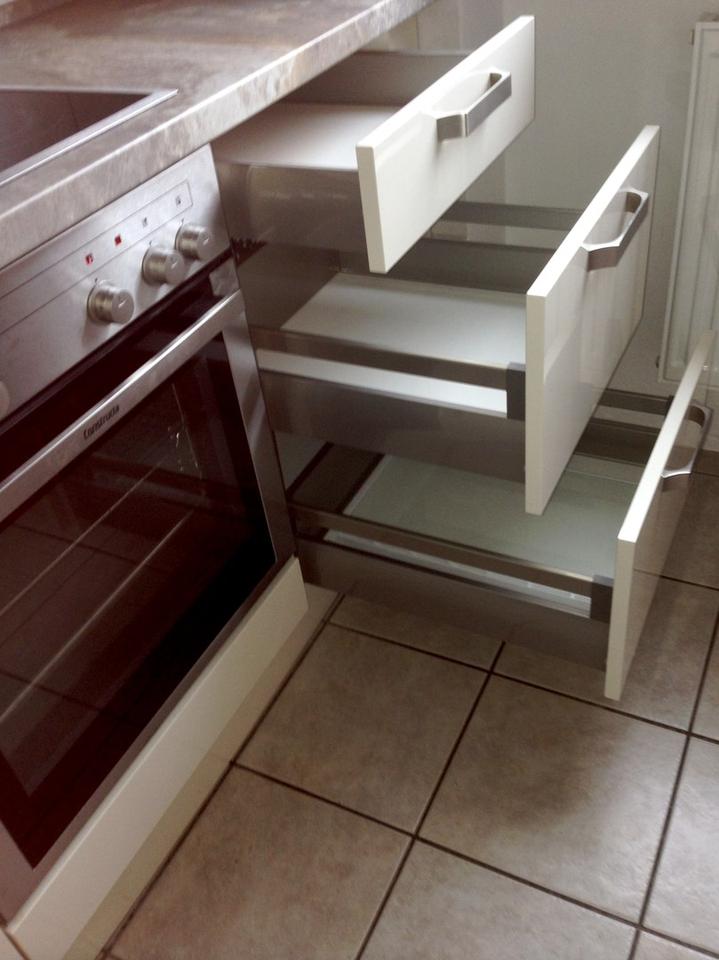Eichenparkett im Wohnzimmer, Designerböden (Vinylböden) in den weiteren Zimmern und im Flur, Fliesen in der Küche und im Bad sowie im WC, weisse Türen, Hochglanzlack Küchenmöbel in Magnolenfarbe, Auszugschubläden und Besteckkasten im Unterschrank, Kücheneßtisch in der Farbe der Arbeitsplatte, der noch orig.verpackt ist, Elektrogeräte: eingebauter Kühlschrank. Ceran Kochplatte, Backofen, Nirosta Spüle, Boiler, Abfalleimer.