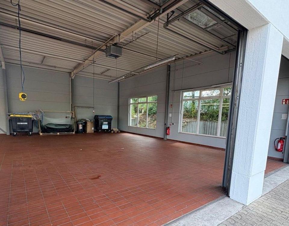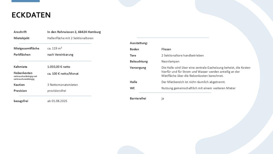 Das im Jahr 2004 errichtete Gebäude befindet sich in einem gepflegten Zustand und liegt in einem etablierten Gewerbegebiet mit guter Anbindung. Die zur Vermietung stehende Hallenfläche ist mit zwei handbetriebenen Sektionaltoren ausgestattet. Der Mietbereich ist rund um die Uhr (24/7) über eine integrierte Schlupftür im linken Tor zugänglich. Zwei große Fenster im rechten Teil der Halle sorgen für eine helle, freundliche Arbeitsatmosphäre.