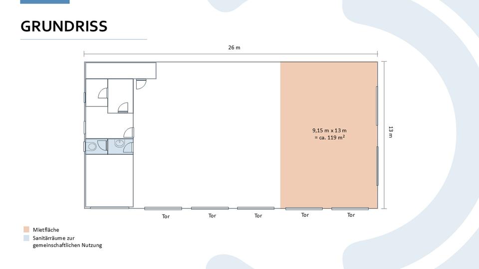Die Mietfläche ist nicht separat abgetrennt und geht offen in einen benachbarten Mietbereich über. Die sanitären Einrichtungen werden gemeinschaftlich mit dem zweiten Mieter genutzt.