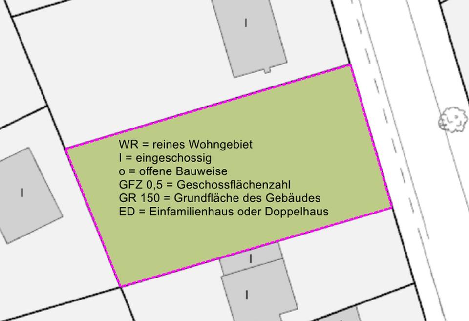 Typ: WR I O / 2W (Reines Wohngebiet, eingeschossig, offene Bauweise).