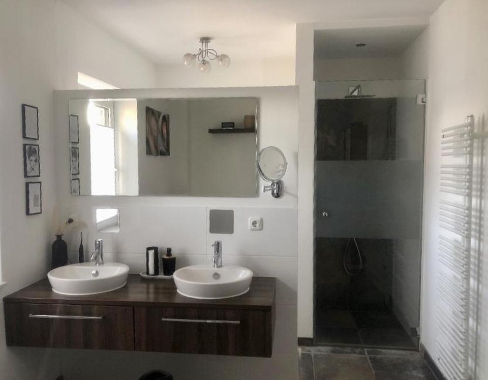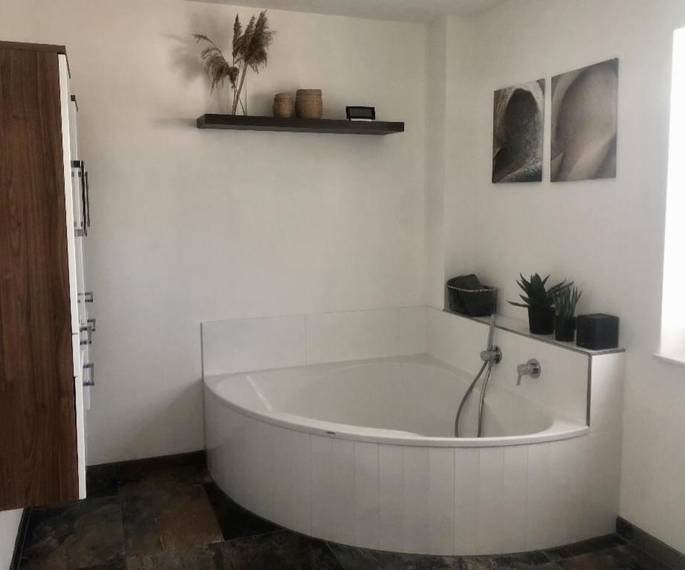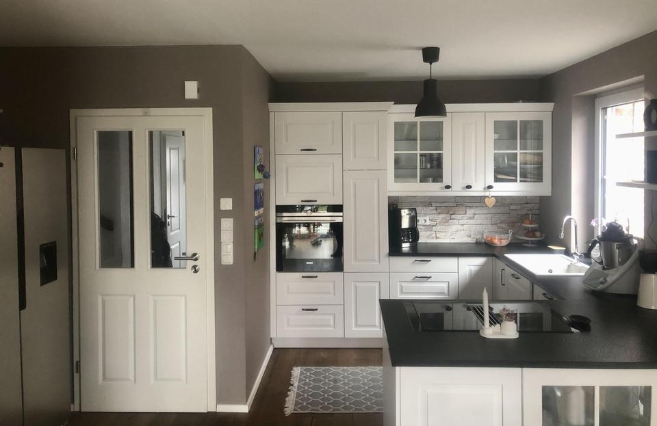 Sie betreten den einladenden Flur mit Nische, die genügend Platz für ihre Garderobe bietet. Der offene und einladende Wohn- und Essbereich ist der perfekte Ort für entspannte Stunden mit der Familie und gesellige Abende. Die offene Küche im modernen Landhausstil mit Granit Arbeitsplatte „Nerro assoluto“ ist ein Traum für jeden Kochliebhaber und bietet ausreichend Platz für kulinarische Kreationen. Moderne Einbaugeräte von Siemens und das Miele Induktionskochfeld mit integriertem Abzug unterstützen Sie dabei. Dank der zahlreichen, bodentiefen Fenster strömt viel Tageslicht in die Räume und schafft eine helle und freundliche Wohnatmosphäre. Der echte Parkett Fußboden sorgt für ein angenehmes Fußklima. Im Erdgeschoss finden Sie zudem das Gäste-WC, einen Hauswirtschaftsraum und einen kleinen Abstell-/Speiseraum unter der Treppe. Alle Fenster im Erdgeschoss sind mit automatischen Rollläden versehen, die sich bequem per Fernbedienung steuern lassen. Über eine stilvolle Holztreppe mit weißen Wangen und Nussbaum-farbenen Trittstufen gelangen Sie in das erste von zwei Obergeschossen. Hier erwarten Sie zwei Schlafzimmer, die Ihnen und ihrer Familie ausreichend Platz für Rückzug und Erholung bieten. Beide Zimmer sind mit heller Vinylware in Holzoptik ausgelegt. Eins davon ist zusätzlich mit einem Ankleideraum ausgestattet, welches mit einer Glasschiebetür abgegrenzt wird. Ein Vollbad mit grau/beige/braunen multicolor Fliesen, einer Eckbadewanne, einer separaten, bodengleicher Regendusche, zwei Aufsatz-Waschbecken, Toilette und Bidet runden das Angebot ab. Im zweiten Obergeschoss erwarten Sie zwei weitere Zimmer, sowie ein weiteres Bad mit Duschkabine, Toilette und Waschbecken. Über eine Bodentreppe gelangen Sie auf den Dachboden, der vielseitig genutzt werden kann und zusätzlichen Stauraum bietet.