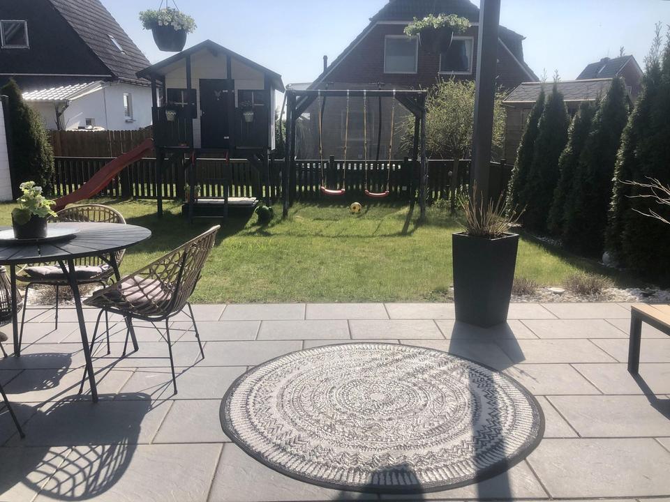 Der Garten mit einer großzügigen Terrasse, der Terrassenüberdachung mit 8mm Sicherheitsglas und elektronischer Unterbaumarkise, abschließbarem Gartenschrank und einem Spielhaus mit zwei Schaukeln, Rutsche und Sandkasten ist ein kleines Paradies für Groß und Klein. Angrenzend ans Haus finden sie einen Kellerersatzraum, in dem Fährrader etc. genügend Platz finden. Direkt vor dem Haus befinden sich zwei PKW-Stellplätze.