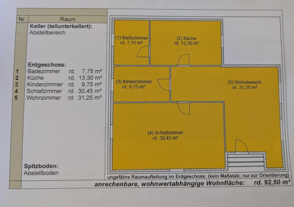 Das Haus bietet ca. 92,5 m² Wohnfläche im Erdgeschoss, aufgeteilt in 3 Zimmer, Küche und Bad. Darüber hinaus verfügt es über ein ausbaufähiges Dachgeschoss mit einer zusätzlichen Nutzfläche von ca. 50 m² – genügend Raum für ein oder zwei weitere Zimmer sowie ein kleines Bad.