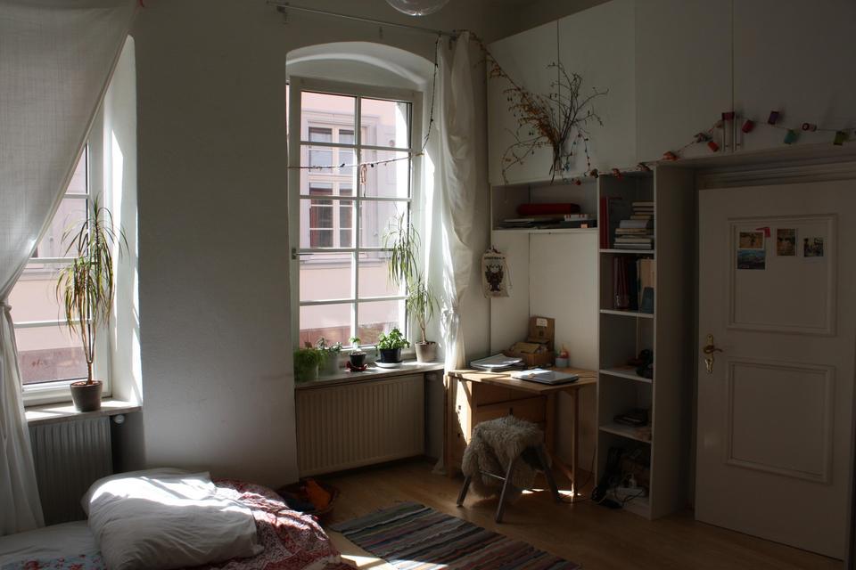 Die Erdgeschosswohnung verfügt über zwei Zimmer, einen kleinen Flur, eine Küche (rote Hochglanzfronten), ein Bad mit verglaster Dusche und Toplader-Waschmaschine (neu 2024). Die Wohnung wird durch den Hausflur getrennt, so dass eines der Zimmer über den Flur erreicht wird. Dieses verfügt über eine in ca. 2 Metern Höhe eingebaute Schlafebene aus Massivholz mit einer Fläche von ca. 2,20×2,20 Metern, so dass die Bodenfläche zur weiteren Nutzung zur Verfügung steht. Die gesamte Raumhöhe beträgt ca. 3,70 Meter. Der Bodenbelag in den Wohnräumen besteht aus hellem Laminat und der Küchenboden ist anthrazitfarben gefliest.