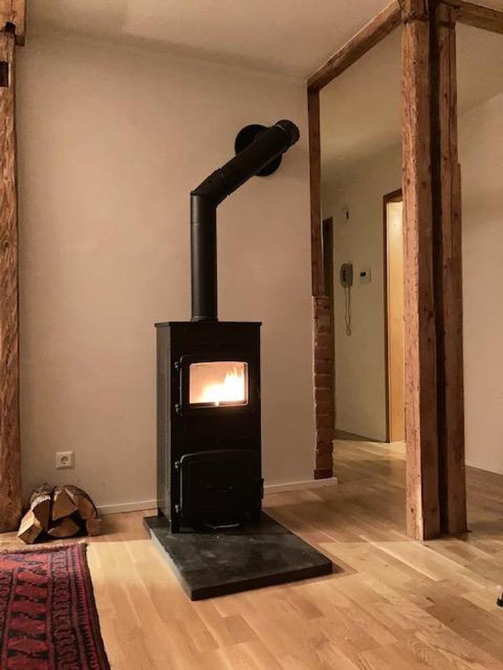 Optional steht ein Kaminofen zur Verfügung, der mit Holz befeuert werden kann.