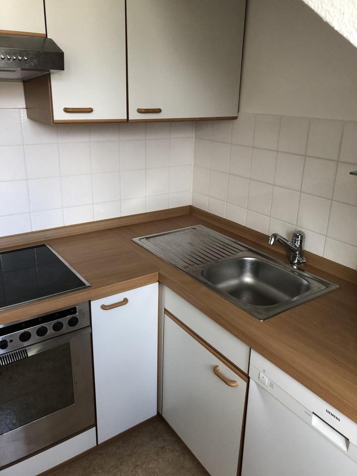 Laminatboden in allen Räumen, vollausgestattete Einbauküche, Küche mit Fenster und Platz für einen kleinen Esstisch.