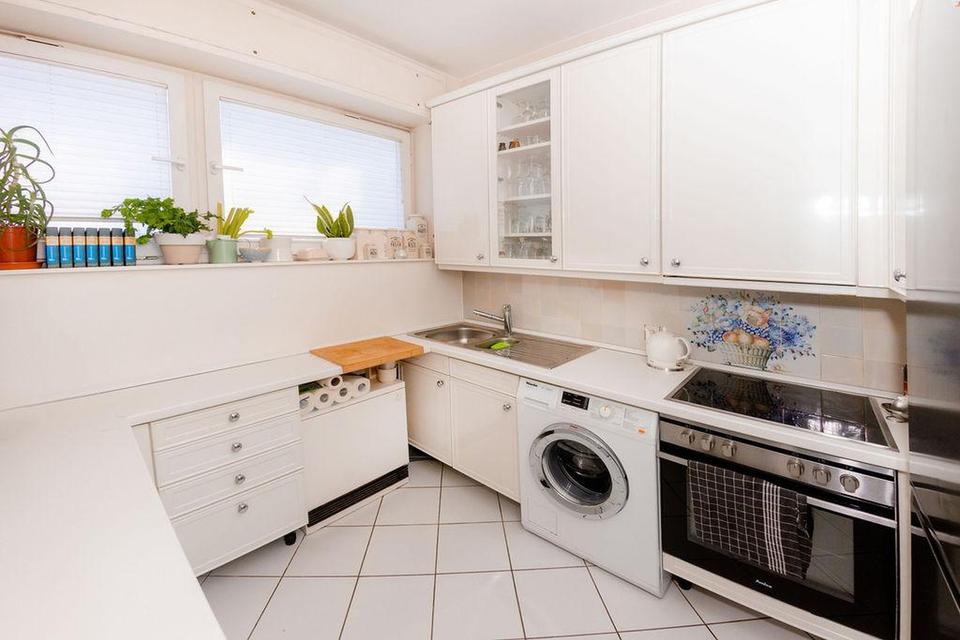 Die separate, voll ausgestattete Miele-Küche bietet ausreichend Platz und ist ideal für den täglichen Gebrauch ausgestattet. Ein stilvolles Marmorbad sowie ein separates WC ergänzen das komfortable Raumangebot.