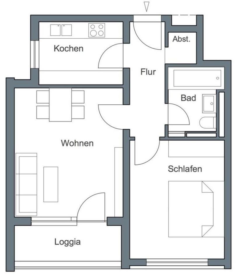 Die Wohnung selbst besticht durch ihren funktionalen Grundriss: ein helles Wohnzimmer mit Zugang zum Balkon, ein geräumiges Schlafzimmer, eine separate Küche sowie ein praktisches Badezimmer.