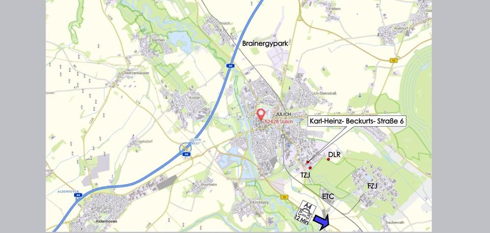 Das Objekt liegt im Gewerbegebiet Königskamp in Jülich – in direkter Nähe zum Technologiezentrum (TZJ) und nur 3 km vom Forschungszentrum Jülich (FZJ) entfernt. Auch das DLR Institut für Solarforschung und die Zuckerfabrik befinden sich im nahen Umfeld.