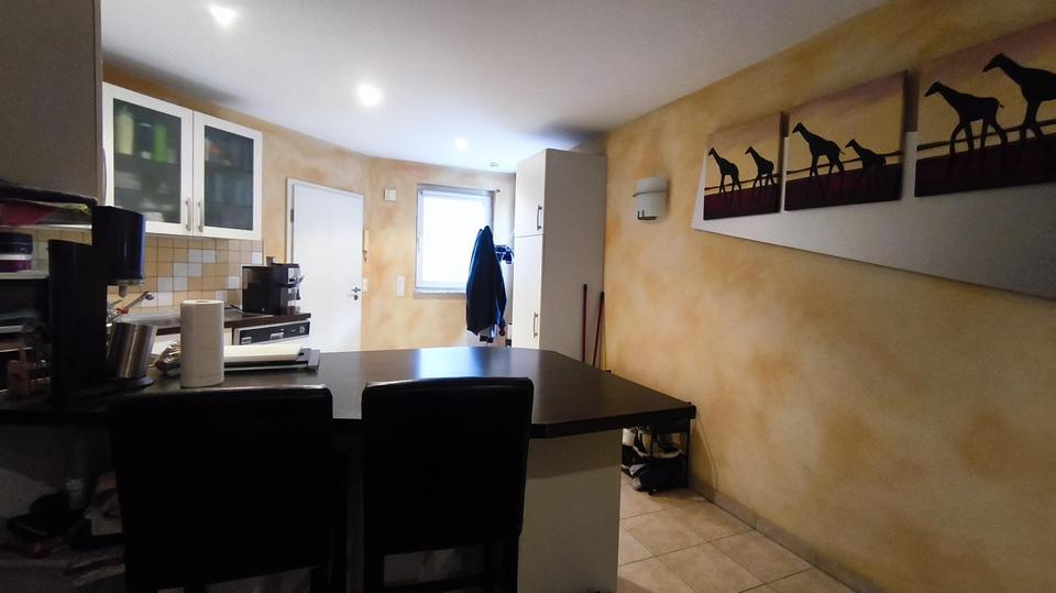 In der Küche befindet sich ein übergroßer Esstisch. Die Küche mit vermietet. Der Betrag ist in der Kaltmiete bereits enthalten.