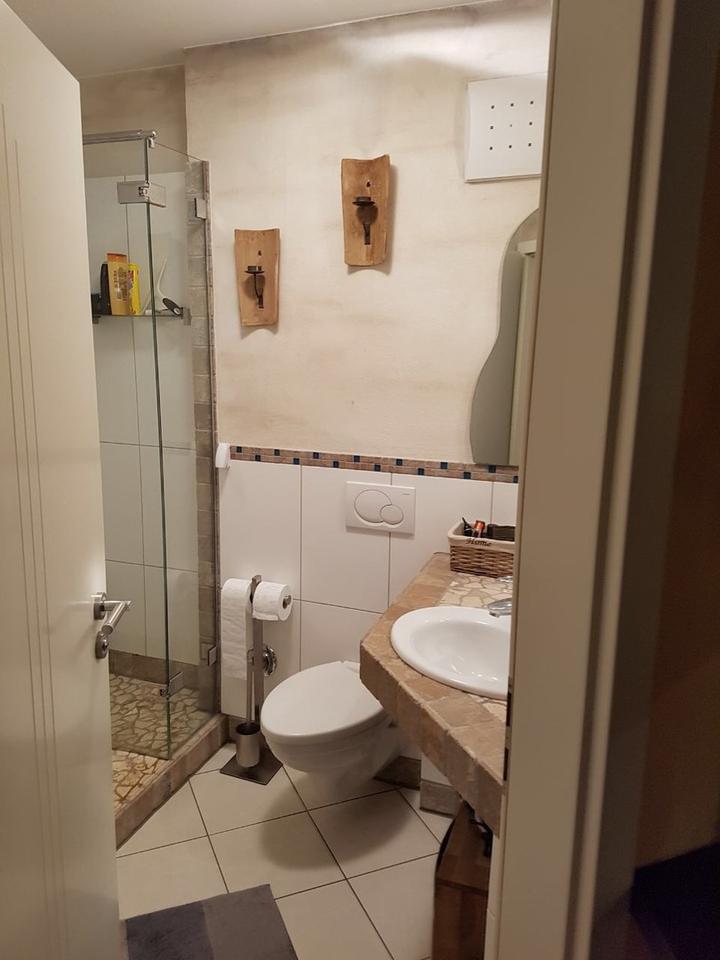 Das hochwertig ausgestattete Bad in Naturmarmor enthält eine große Dusche und einen ansprechenden Waschtisch. Ferner befindet sich dort das WC.