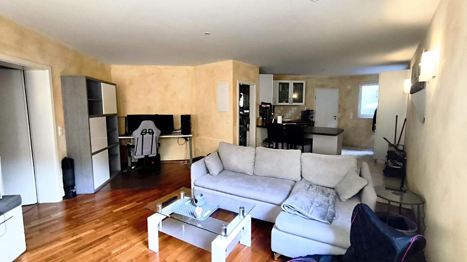 Aufteilung der Wohnung: Es gibt einen großen Wohn-/Esszimmerbereich, der in einen großen Küchenbereich übergeht (offene Küche).