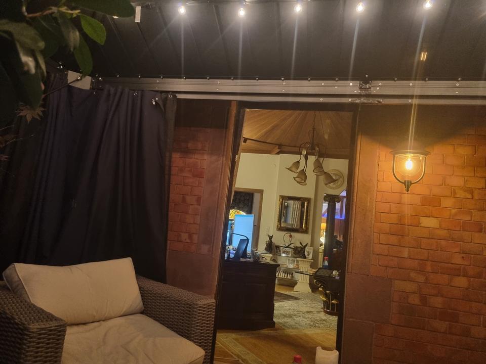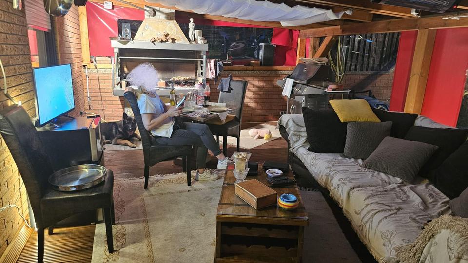 •Eine voll überdachte Terrasse mit großem Grill, perfekt für gesellige Abende.