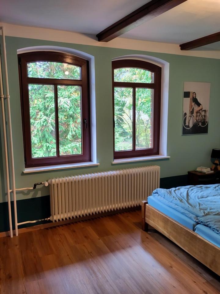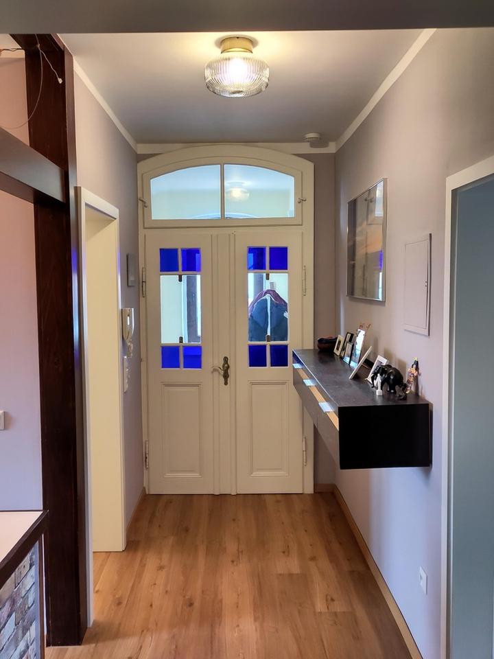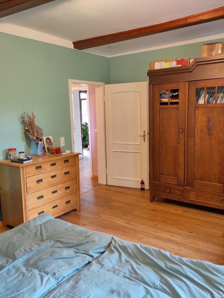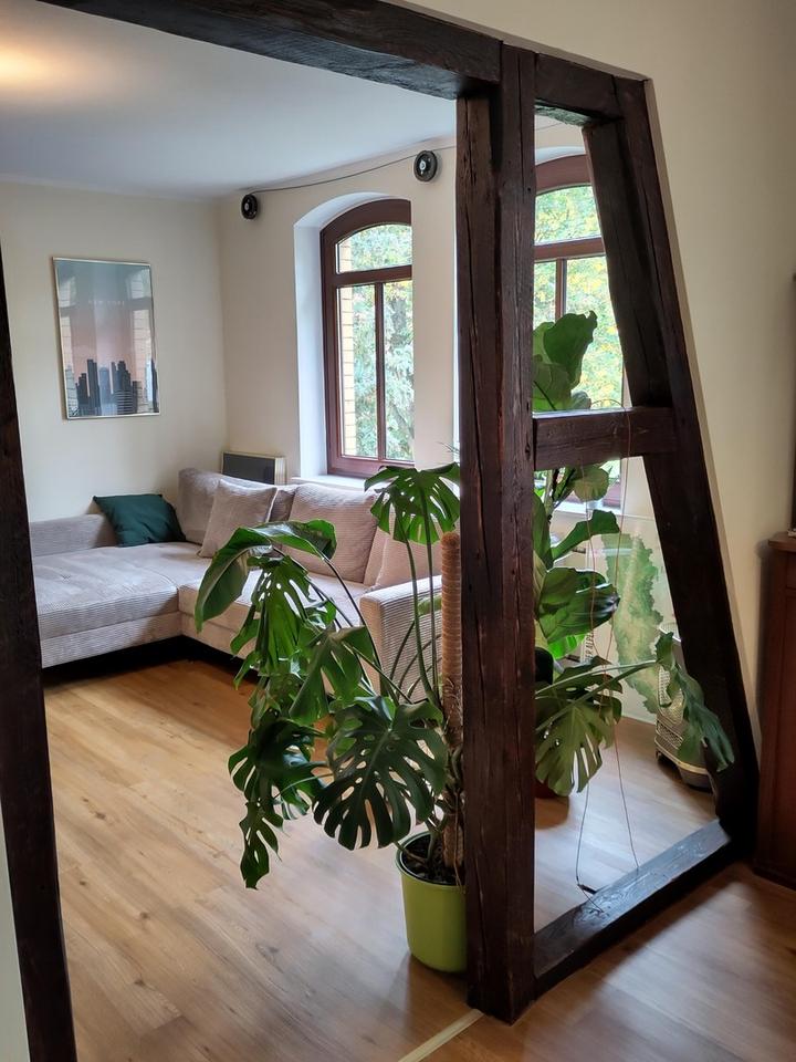 Die vorderen zwei Zimmer sind mit einem vergrößerten Durchgang verbunden und im Obergeschoss wurde das Fachwerk freigelegt, um mehr Raum zu schaffen. Durch den innenliegenden Fachwerkaufbau lässt sich die Wand schnell wieder schließen oder es kann einfach wieder eine Tür eingebaut werden. Ist geschlossener Raum gewünscht, kann zum Wohnungsflur eine Tür eingebaut werden.
