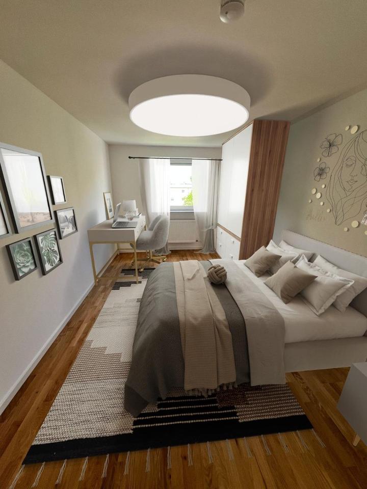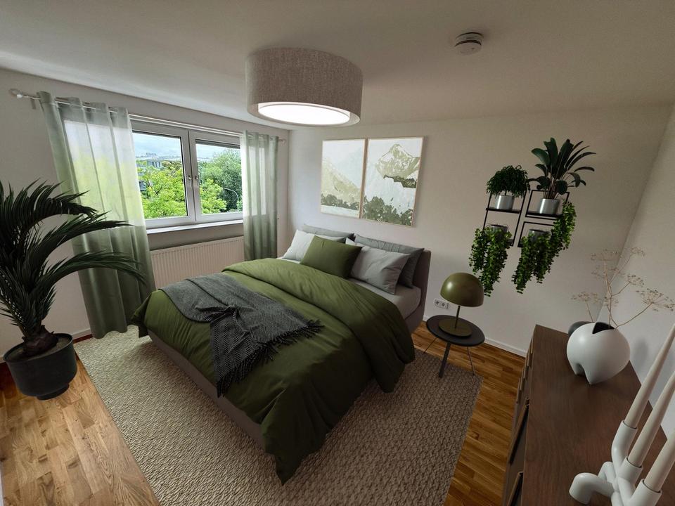 Nach dem Bad ebenfalls auf der linken Seite befindet sich die Küche, danach geht´s geradeaus ins Schlafzimmer. Gegenüber der Küche, auf der rechten Seite des Flures befindet sich der große Wohn-Essbereich. Vom Wohnzimmer aus gelangen Sie auf den 10qm-großen Balkon, der genau nach Westen ausgerichtet ist und auf dem sich perfekt die Abendsonne genießen lässt. Rechts vom Eingang befinden sich die beiden Kinderzimmer, die sich natürlich alternativ auch als Ankleidezimmer oder Homeoffice nutzen lassen. Die hervorragend geschnittene Wohnung eignet sich bestens für eine Familie mit ein oder zwei Kindern oder selbstverständlich auch für ein Pärchen, das einfach etwas großzügiger leben will.