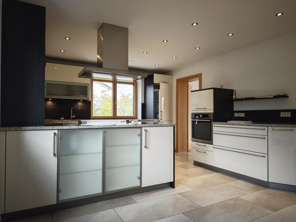 Komplette große Einbauküche mit neuwertigen Schränken, abgehängte Decke mit Lichtspots