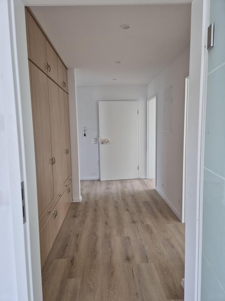 Teilweise ist die Wohnung bereits mit maßgefertigtem Möbiliar ausgestattet. Dazu zählen ein Badschrank im WC, ein großer, passgenauer Einbauschrank im Flur sowie vorbereitete Anschlüsse im Wohnzimmer für eine dezente, indirekte Deckenbeleuchtung. Elektrische Rollläden im Wohnzimmer sorgen für zusätzlichen Komfort.