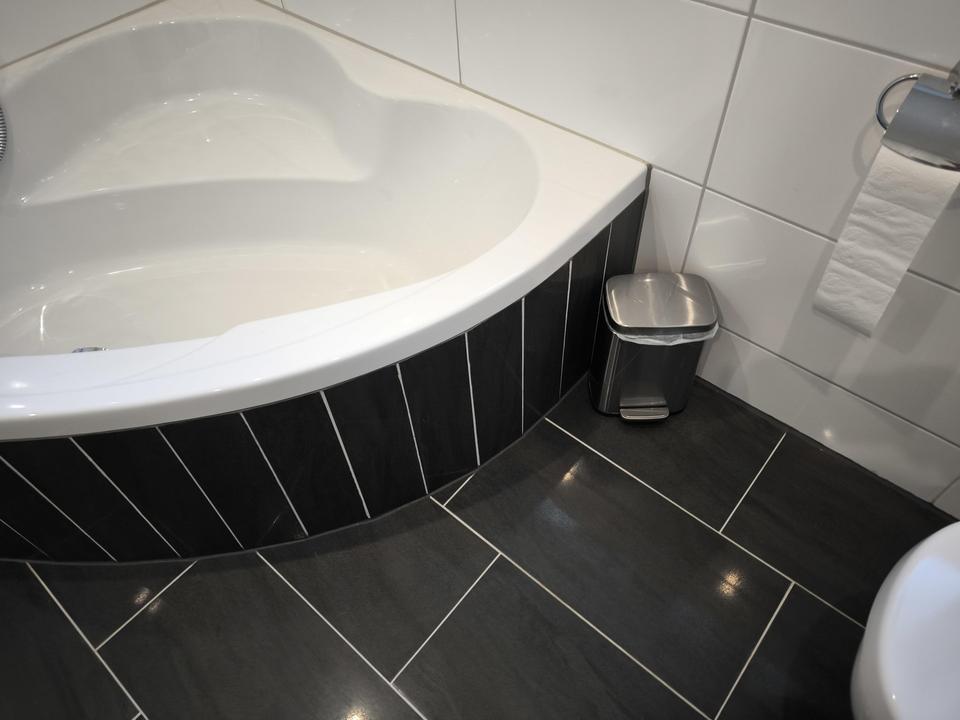 – Dreieckbadewanne, Toilette, Spiegel mit Internetanschluss,