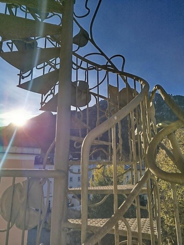 Von einem kleinen Balkon gelangt man über eine geschwungene Wendeltreppe auf die großzügige Dachterrasse mit herrlichem rundum Bergblick, der zum Verweilen einlädt.
