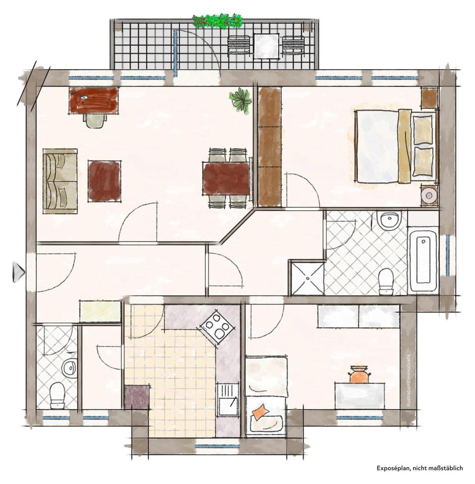 Die hier angebotene 74 m² große Einheit teilt sich auf in einen Flur, ein Gäste-WC (Tageslicht), einer geräumigen Küche mit angrenzendem Abstellraum, ein helles Wohn- und Esszimmer von dem der Südwestbalkon zu erreichen ist, einem Vollbad (Tageslicht), ein Kinderzimmer sowie ein Schlafzimmer.