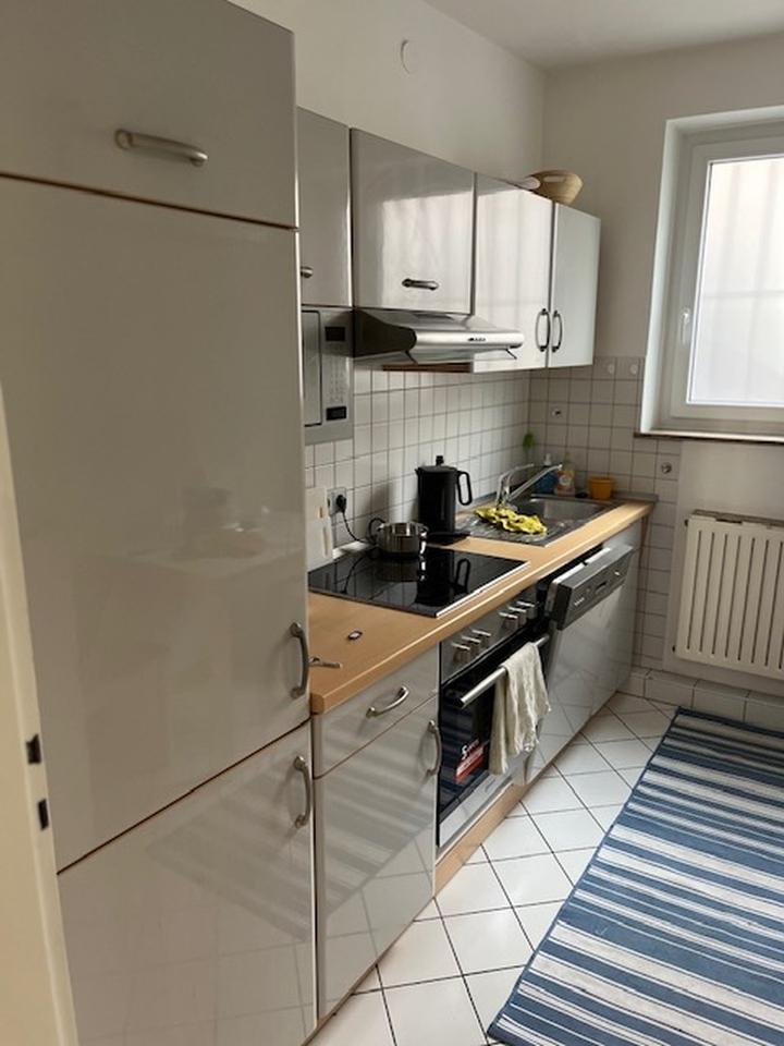Einbauküche mit neuen Geräten: Herd/Ceranfeld, Backofen, Spülmaschine, Mikrowelle und Kühlschrank.