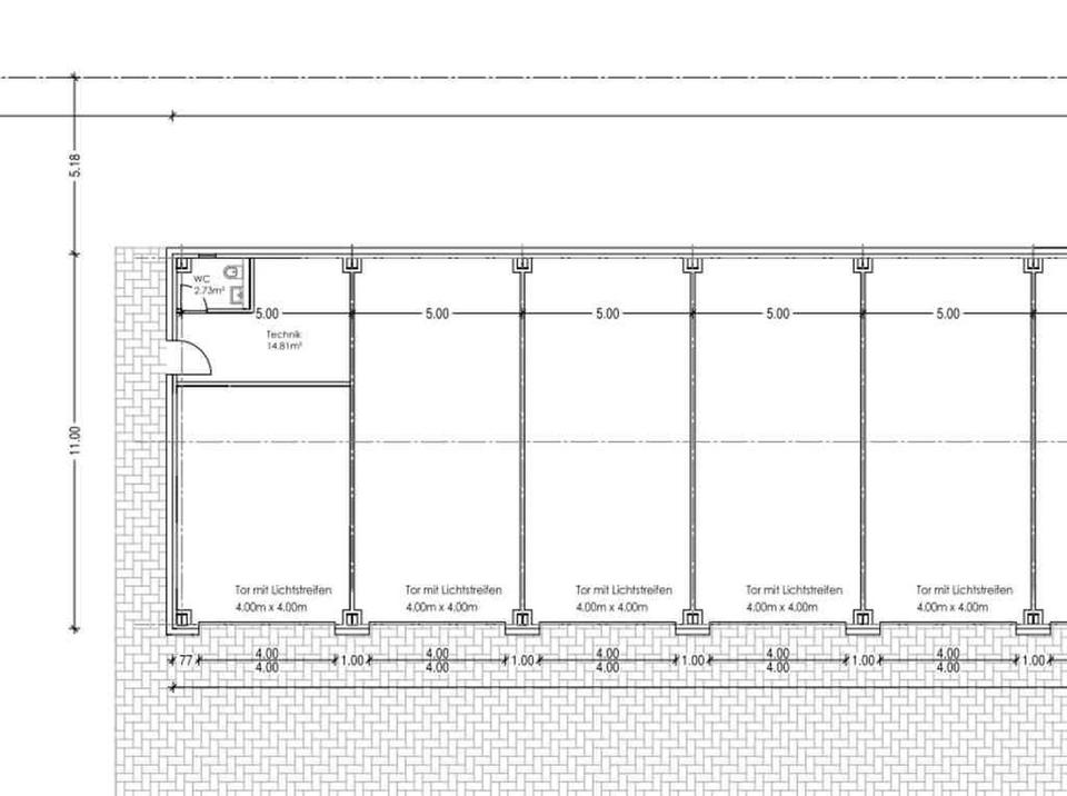 Die Lagerhalle hat eine Grundfläche von 11m x 5m und verfügt somit insgesamt über eine Lagerfläche von insgesamt 55qm.