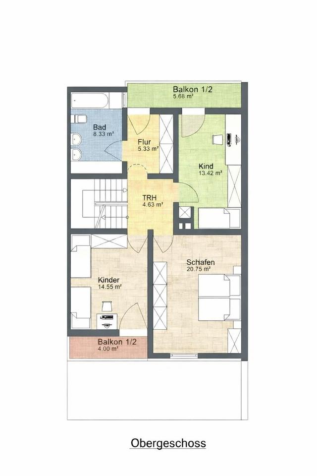 Im Obergeschoss sind über einen kleinen Flur auf der Gartenseite zwei Zimmer mit knapp 15m² beziehungsweise knapp 21m² direkt erreichbar. Das kleinere der beiden Zimmer verfügt über eine Loggia mit 4m² zum Garten.