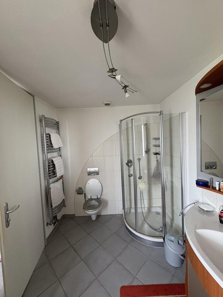 Das Badezimmer mit gut 8m² verfügt über ein Fenster und ist aktuell mit Badewanne, Dusche, Waschbecken und WC ausgestattet.