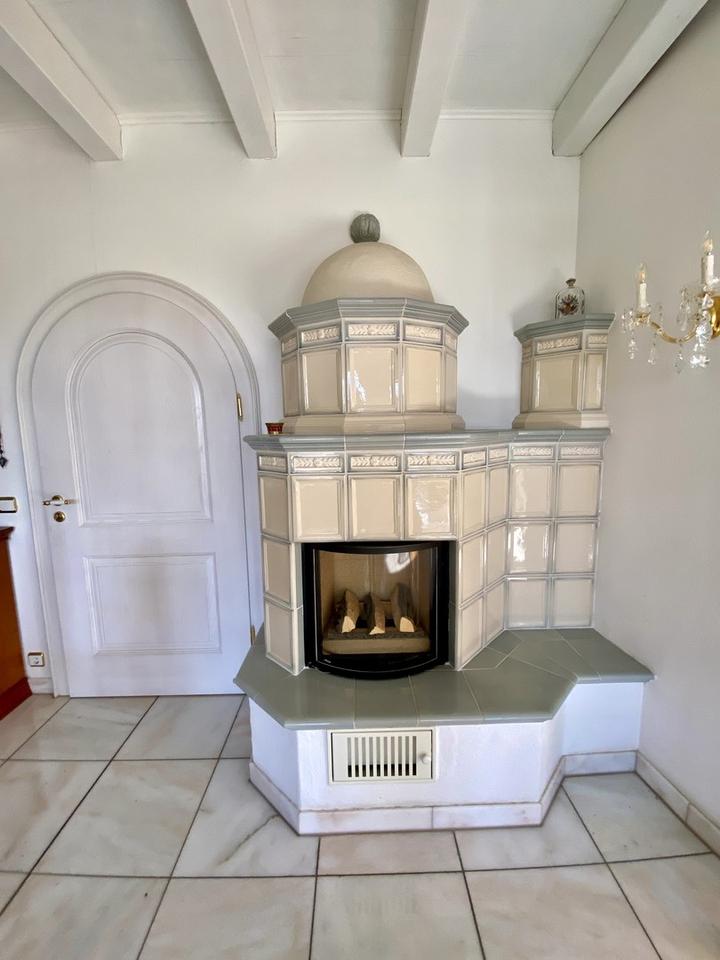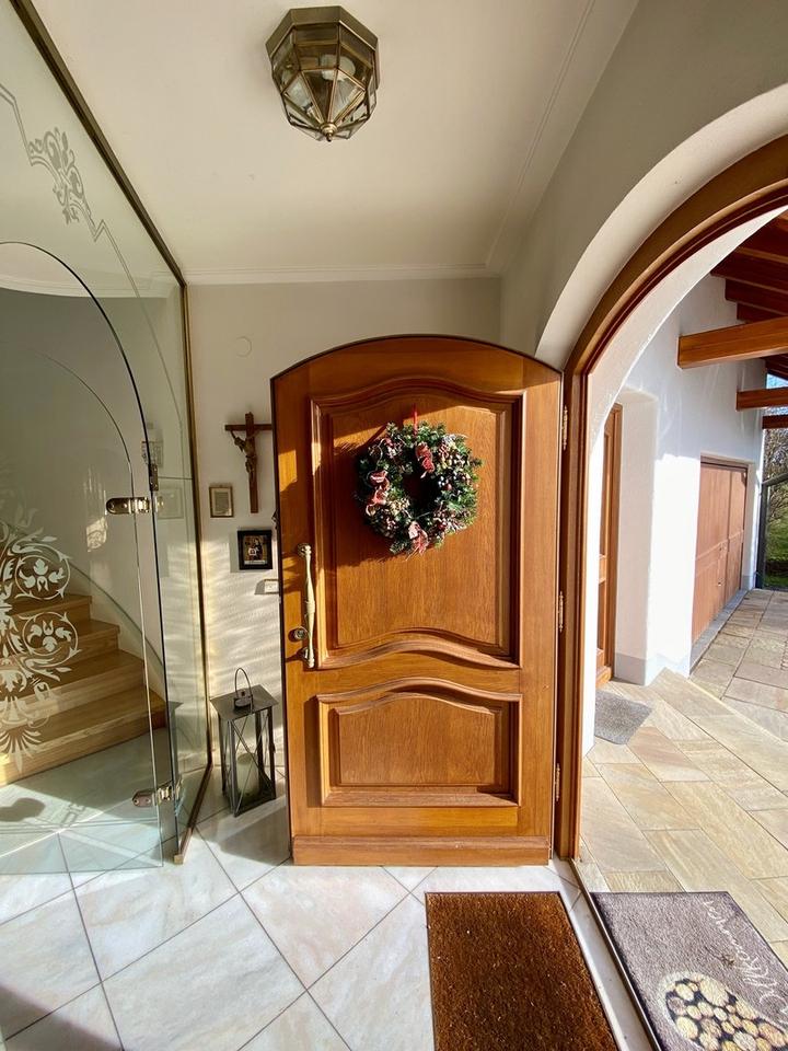 Schon der Eingang mit der besonders hochwertigen Massivholz-Eingangstür öffnet den Blick auf die runde Diele und den klassisch-modernen Kachelofen. Offen und hell, mit Marmorboden und Freitreppe als Blickfang, eine elegante Einladung zum Eintreten.