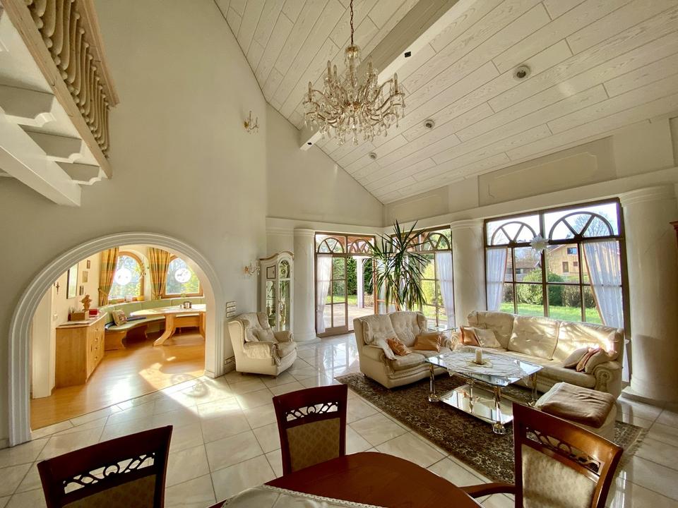 Im anschließenden großen Wohnzimmer, dem Herzstück der Villa, durchströmt das Tageslicht den gemütlichen und edel luxuriösen Raum.